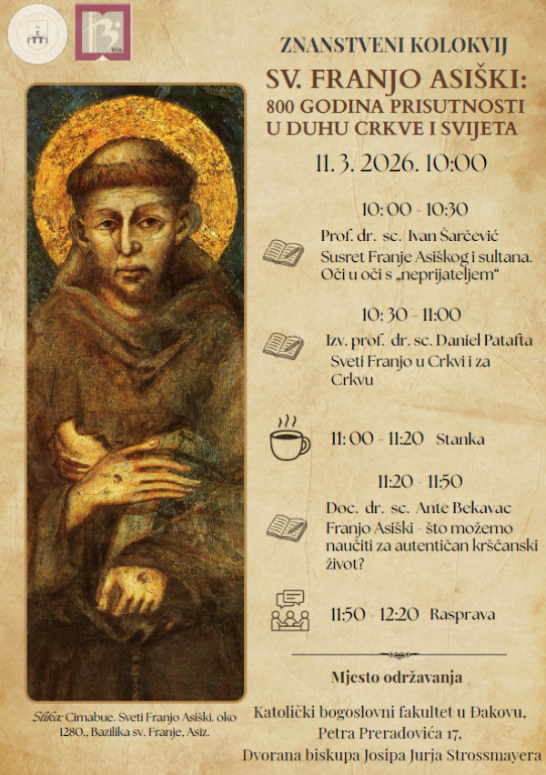 U povodu 800. obljetnice smrti sv. Franje Asiškog, Katolički bogoslovni fakultet u Đakovu organizira znanstveni kolokvij posvećen njegovoj karizmi i trajnoj duhovnoj baštini. Raspravljat će se o njegovom odnosu prema stvorenome, siromaštvu, bratstvu i obnovi Crkve, s naglaskom na aktualnost franjevačkog naslijeđa u suvremenim crkvenim i društvenim izazovima.