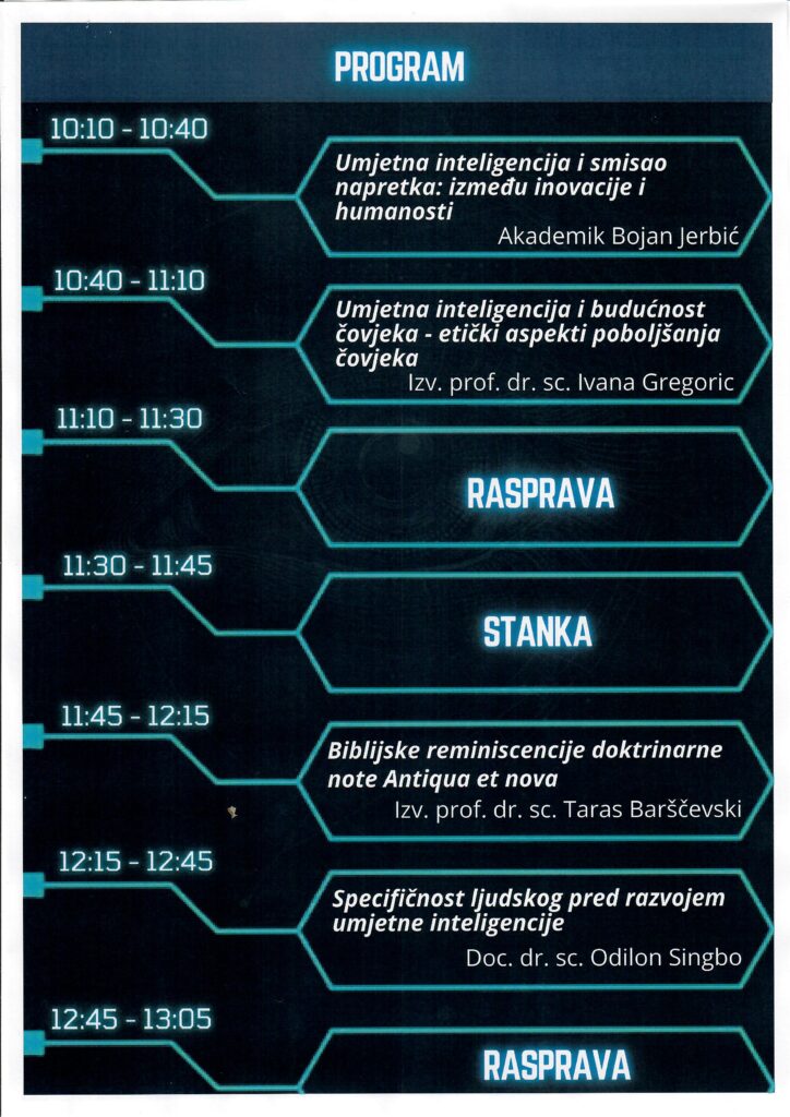 Katolički bogoslovni fakultet u Đakovu organizira interdisciplinarni znanstveni kolokvij: Umjetna inteligencija i granice čovještva u srijedu, 26. studenoga s početkom u 10 sati. Povod raspravi je doktrinarna nota Antiqua et nova, koja poziva na kritičko promišljanje izazova umjetne inteligencije. Kolokvij želi otvoriti dijalog između teologije, filozofije, antropologije, etike i znanosti o pitanjima savjesti, identiteta i duhovnosti u digitalnom dobu.