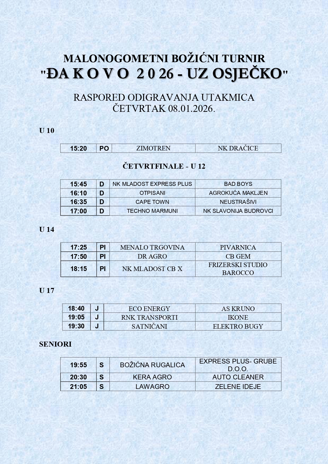 Raspored odigravanja utakmica za četvrtak, 8. 1. 2026.