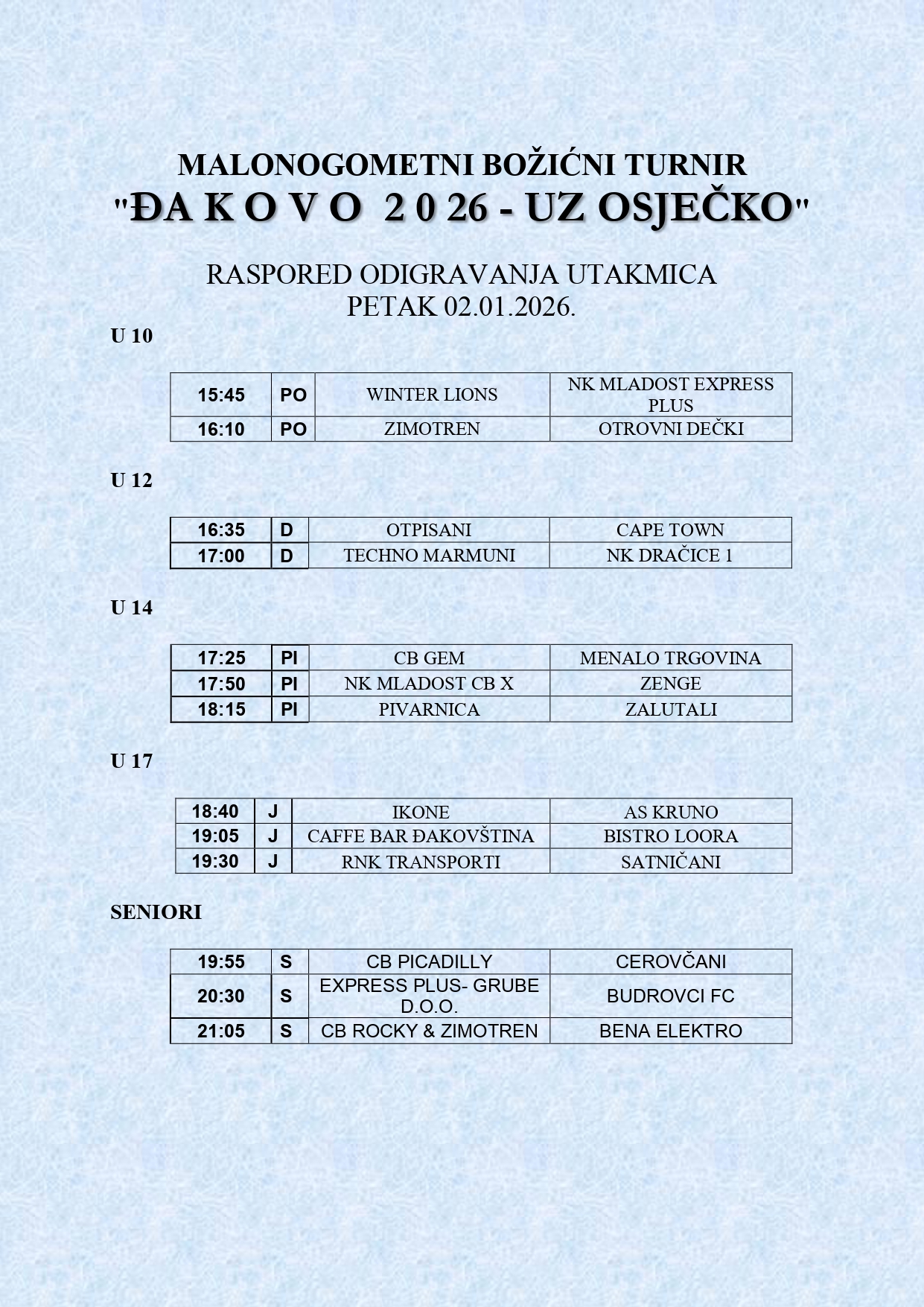 Raspored odigravanja utakmica za petak, 2. 1. 2026.