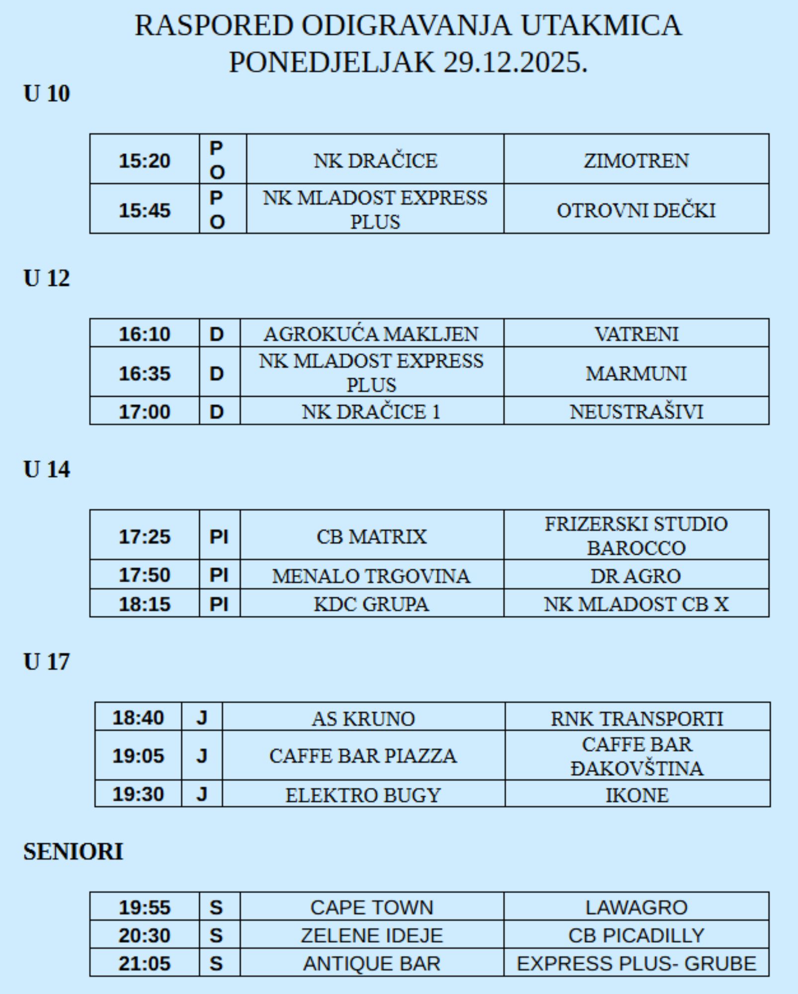 Raspored odigravanja utakmica za ponedjeljak, 29. 12. 2025.