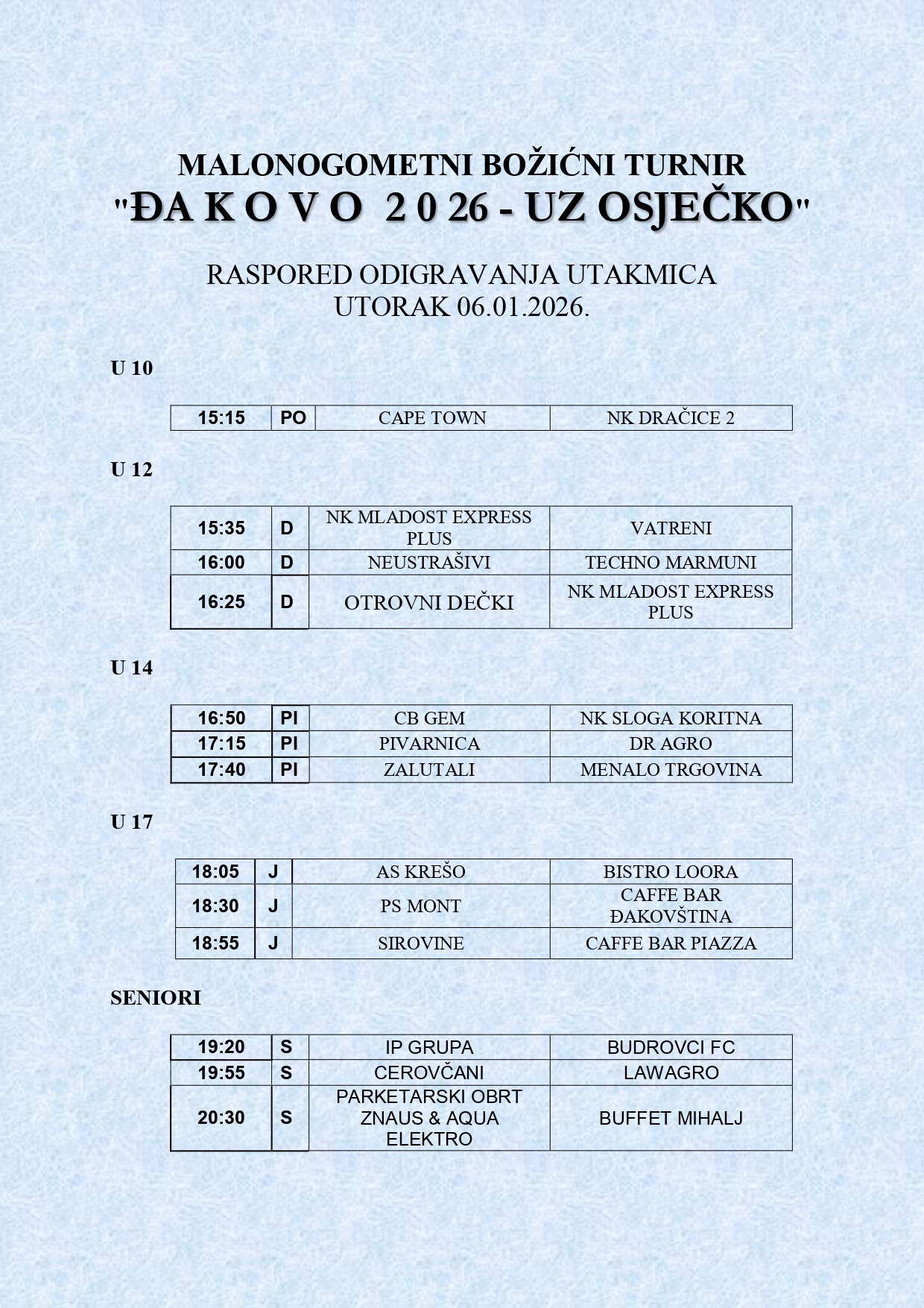 Raspored odigravanja utakmica za utorak, 6. 1. 2026.