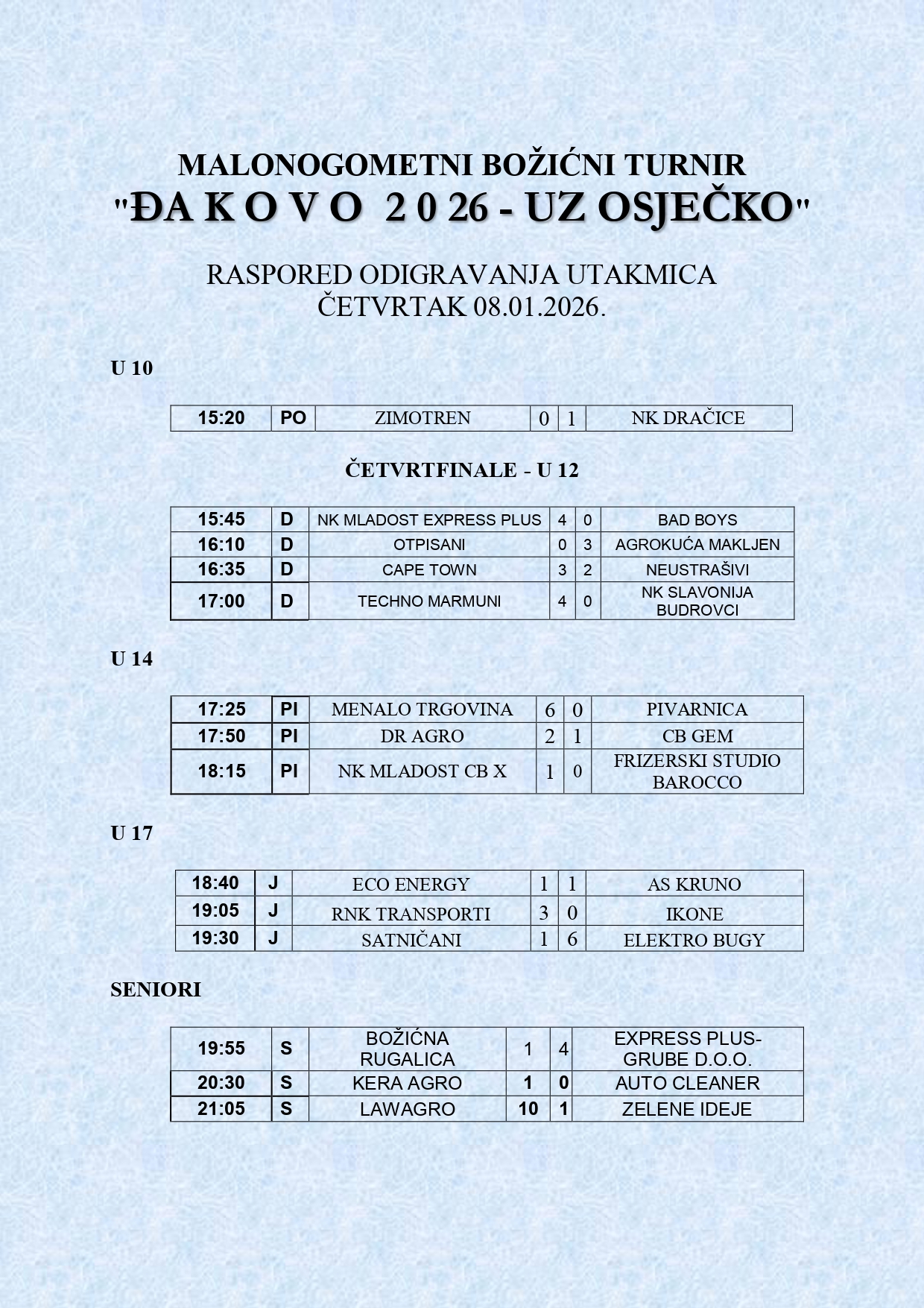 Rezultati utakmica od četvrtka, 8. 1. 2026.