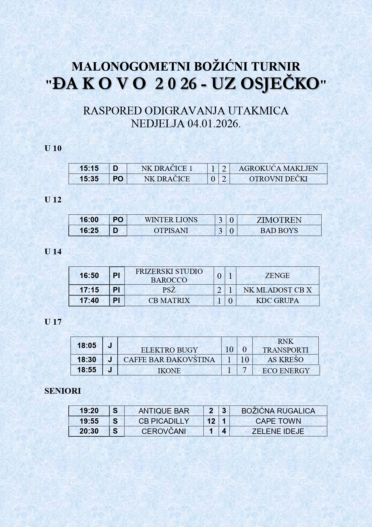 Rezultati utakmica od nedjelje, 4. 1. 2026.