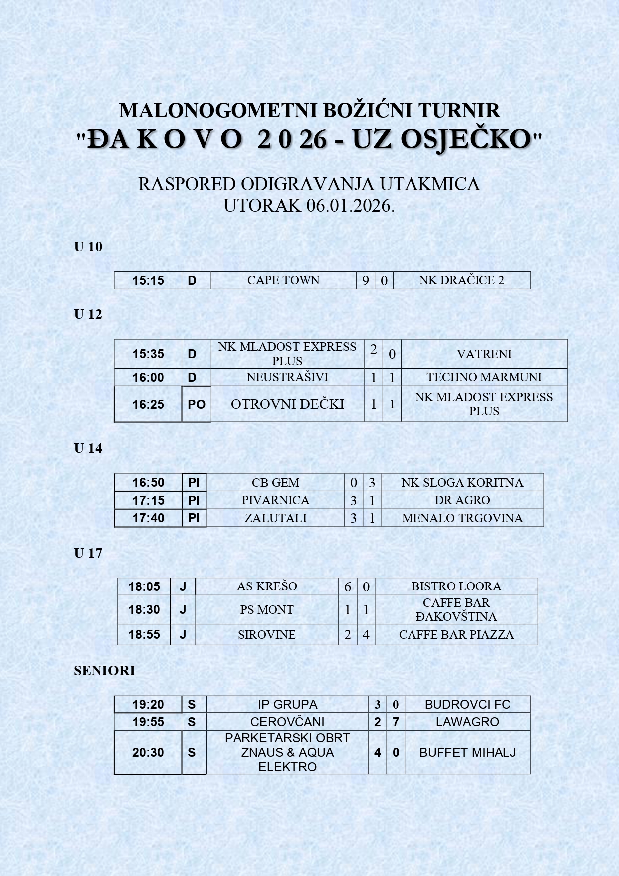 Rezultati utakmica od utorka, 6. 1. 2026.